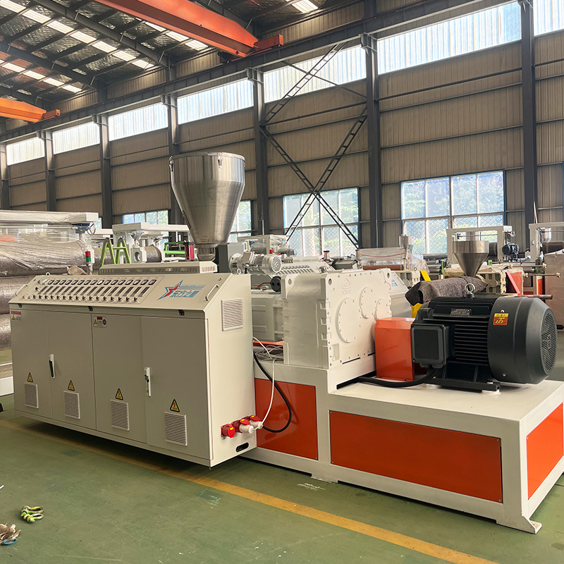 Extrusoras cônicas de dupla rosca, equipadas com diversas especificações de moldes e equipamentos auxiliares fabricados pelaMáquinas plásticas Co. de Qingdao Eaststar, Ltd.,pode processar diretamente o pó de PVC em produtos plásticos, como tubos, folhas e perfis.