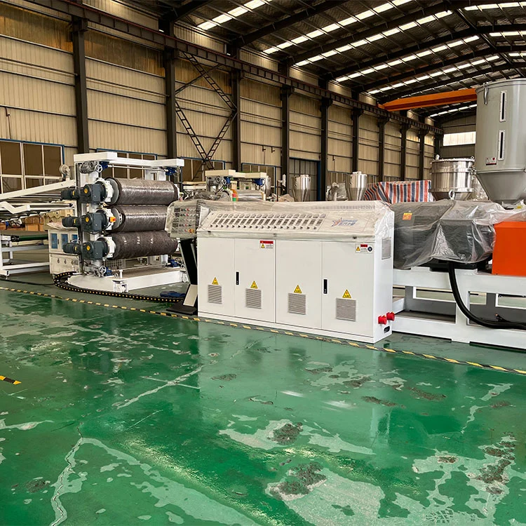 A extrusora de placa eletrostática de PVC inclui uma extrusora de parafuso única, uma máquina de extrusora de placa, um calendário de três rolos, um suporte de resfriamento, uma máquina de transporte, uma máquina de corte e uma plataforma de transporte. A extrusora é usada principalmente para derreter partículas de plástico e o molde é usado para moldagem preliminar. O calendário de três rolos é usado para modelagem e cura adicional. A máquina de transporte é usada para puxar a serra de corte e cortar o comprimento correspondente de acordo com as necessidades do cliente.