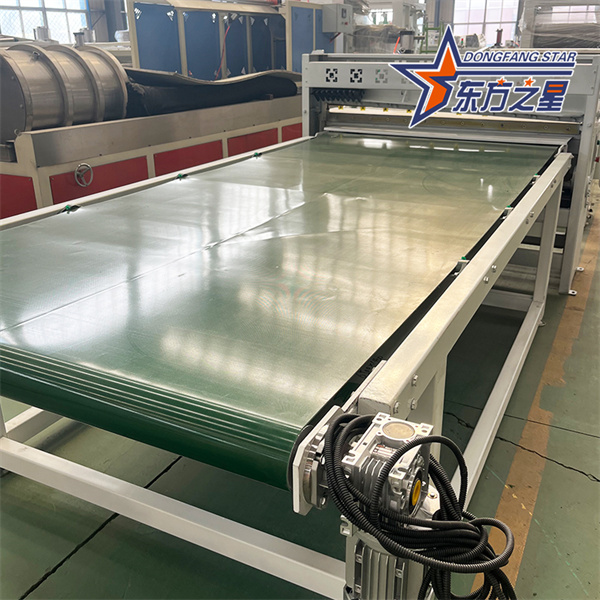 Trator:Geralmente composto por dois ou mais rolos, é usado para transportar a chapa calandrada para frente a uma velocidade estável para garantir a continuidade da produção da chapa e cooperar com a extrusora e a calandra para controlar a espessura e a precisão dimensional da chapa.